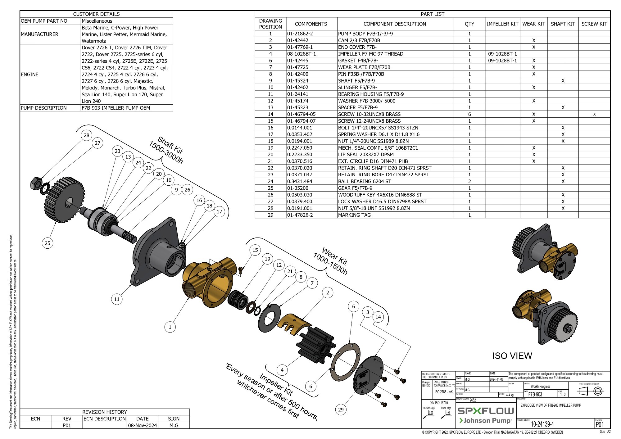 Refurbish your Johnson 10-24139-4 bronze pump with SPX Flow OEM replacement parts. The kit includes impellers, cams, end covers, wear plates, mechanical seals, O-rings, gaskets, and all essential components for a complete raw water pump rebuild.