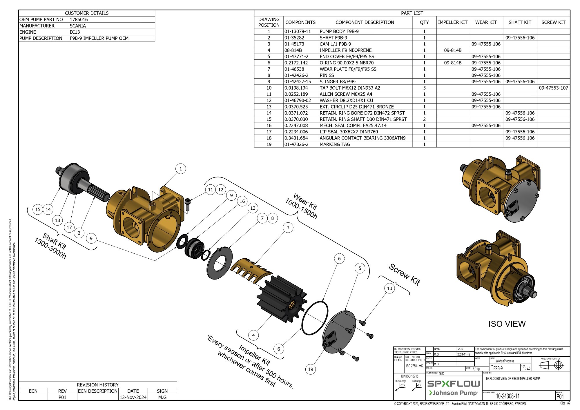 Give your Johnson 10-24308-11 bronze pump a new lease of life with SPX Flow OEM replacement parts. This complete raw water pump refurbish kit includes impellers, cams, end covers, wear plates, mechanical seals, O-rings, gaskets, bolts, nuts, and all essential components for reliable marine performance.