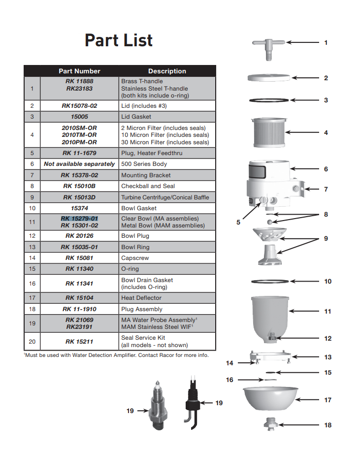 Complete range of Racor 500MA Turbine Series diesel filters, assemblies, and seal kits. Available in 2, 10, or 30 micron ratings, these filters ensure superior protection for diesel engines. Compatible with 2010SM (2 micron), 2010TM (10 micron), and 2010PM (30 micron) elements.